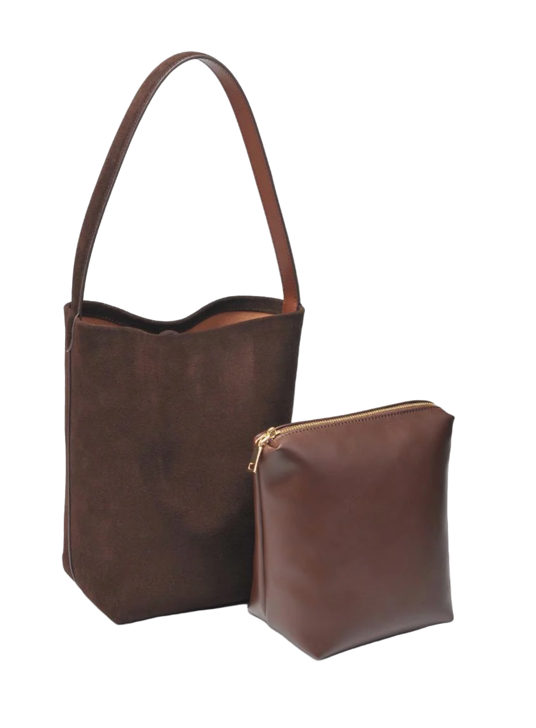 - Exterior Details: Bucket Silhouette, Minimalist Design, Gold Hardware