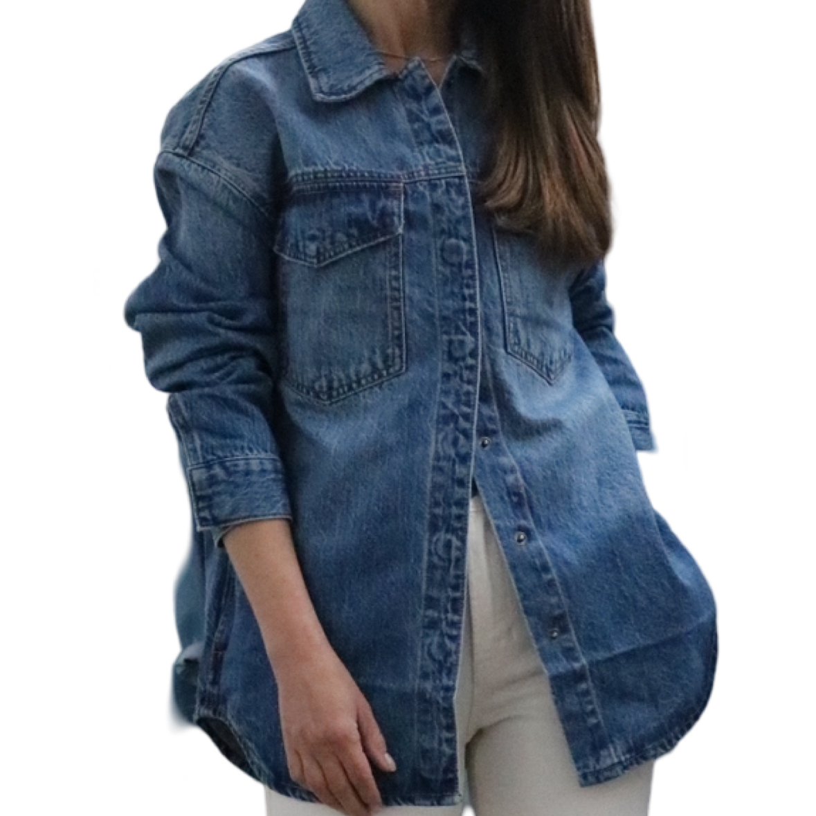 An oversized menswear inspired denim jacket with a cool girl edge. The relaxed style has dropped shoulders that flow into sleeves just slightly long enough to add to the oversized element. With pockets and the option to wear buttoned or layered.