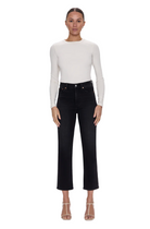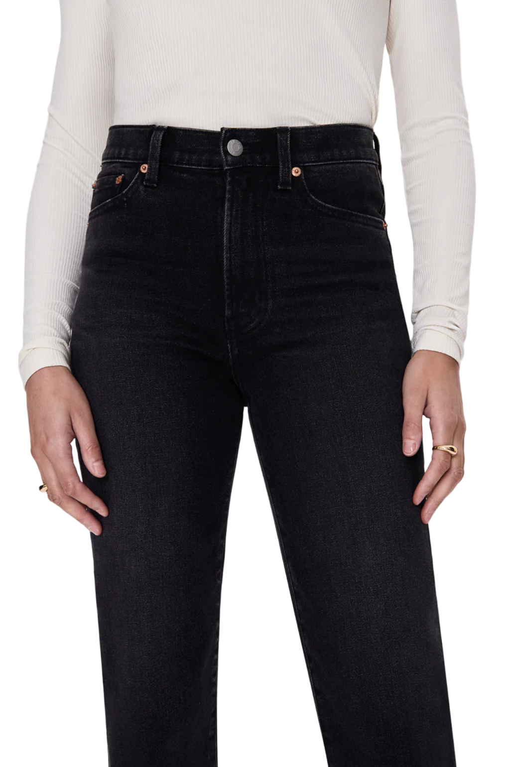 The straight leg with no compromise. Charlie hugs at the high-rise waist before falling into a classic straight silhouette and cropped 27" inseam that hits at the perfect ankle length. The clean finished hem brings refined detail to the timeless proportions. Crafted from our signature comfort stretch denim in Dark Midnight, our exclusive black wash featuring subtle lived-in fading and contrast hardware.