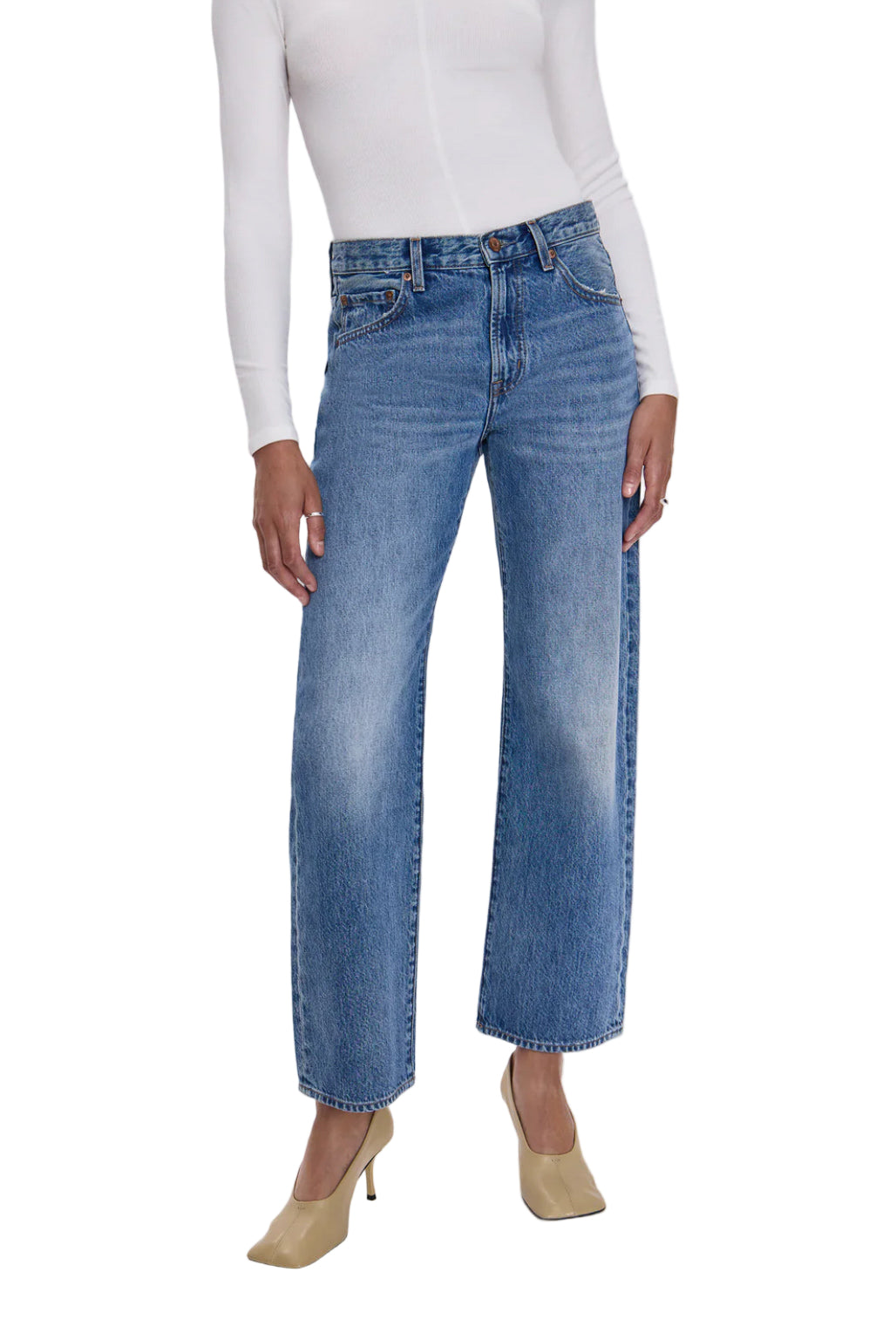 Lexi features a mid-rise and bowed straight leg with a subtle curve through the knee for effortless shape. Finished with a 29" inseam and clean hem for a polished finish. Crafted from rigid denim in Metropolis, a medium indigo wash with authentic fading and whiskering that delivers lived-in character.