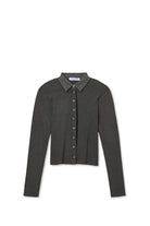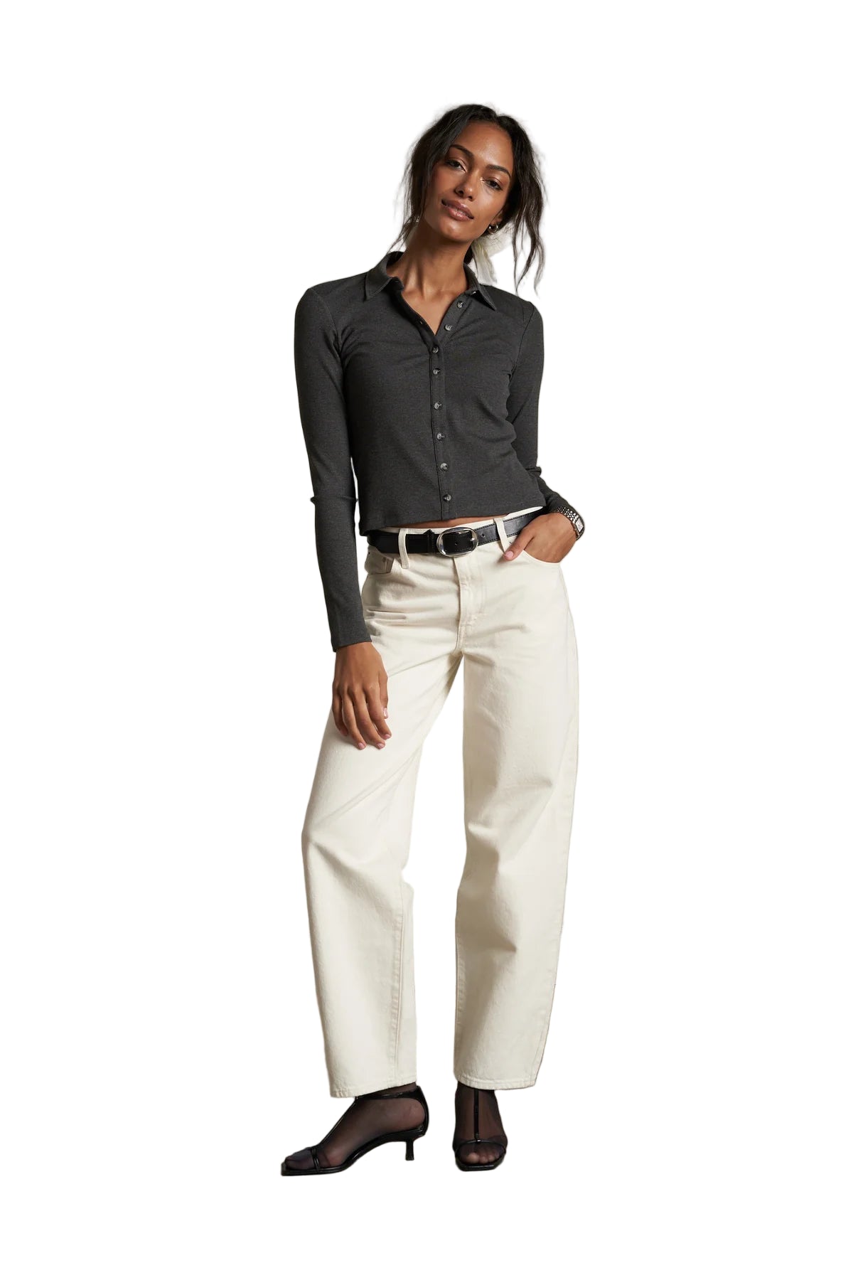 The amee top is a luxe rib essential with a polished twist. fitted through the body with a full button-down front and soft collar, this one sits right at your belly button for that just-right proportion. wear it open over a tank or buttoned all the way up, she’s made to style both ways.