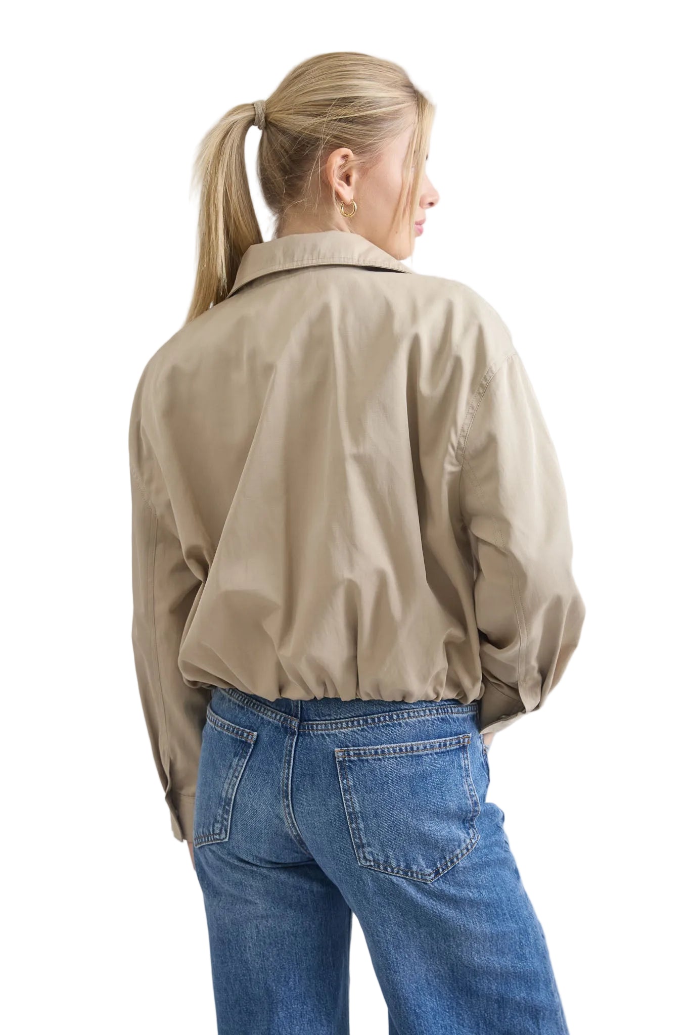 High collar jacket with long sleeves. Front pockets. Elastic hem and front zipper closure.