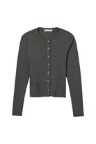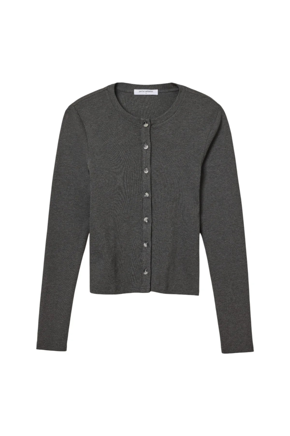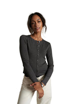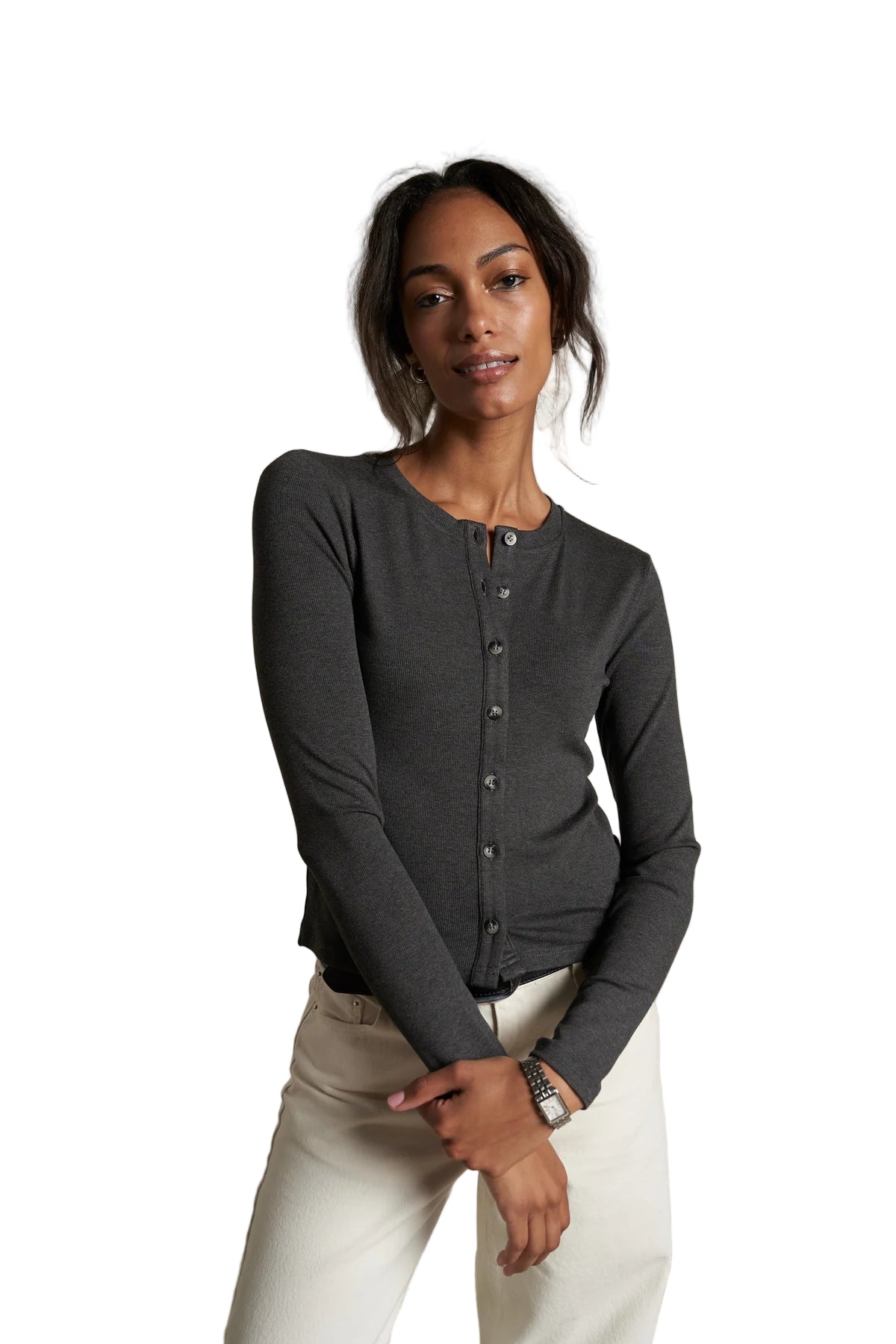 the maureen top is your fitted button-down, upgraded. made from our luxe rib, this long sleeve style is soft, sculpted, and hits right below the belly button. with just the right amount of stretch and a clean silhouette, she layers with ease and holds her own when worn solo.