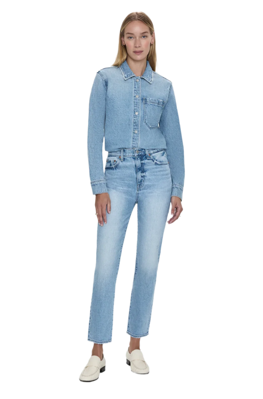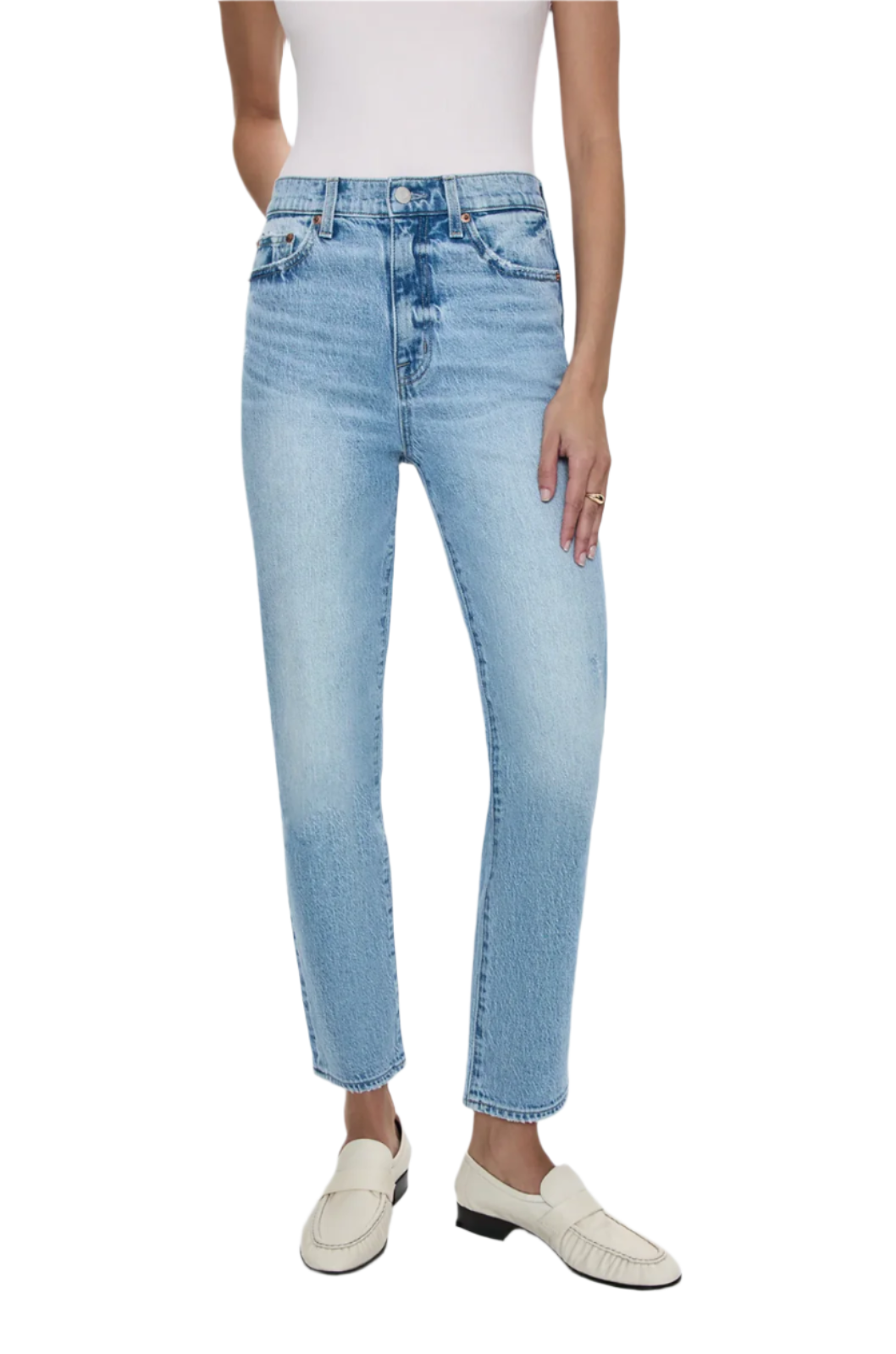High rise waist with a slim straight leg silhouette and ankle crop inseam. Crafted from our signature comfort stretch denim. Scholar Vintage is a crisp, light blue denim wash featuring a slimming fade and subtle whisker details.