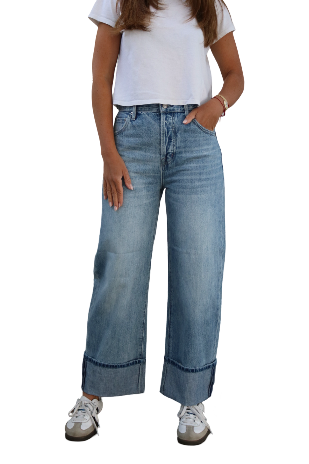 High rise waist with a relaxed, straight leg fit and an oversized cuffed ankle hem. Crafted from rigid, lightweight denim without stretch for an expert fit that holds its shape. Essex is a light blue denim wash with vintage fading and whiskering.