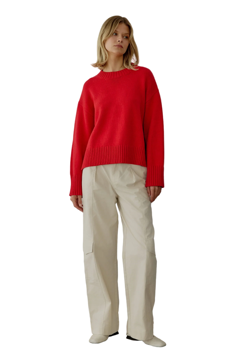 An oversized cropped pullover sweater with a classic rib detail at the neckline and hem. The semi-cropped length ensures a proportional fit and the mid-weight fabrication makes it perfect for the colder seasons ahead.