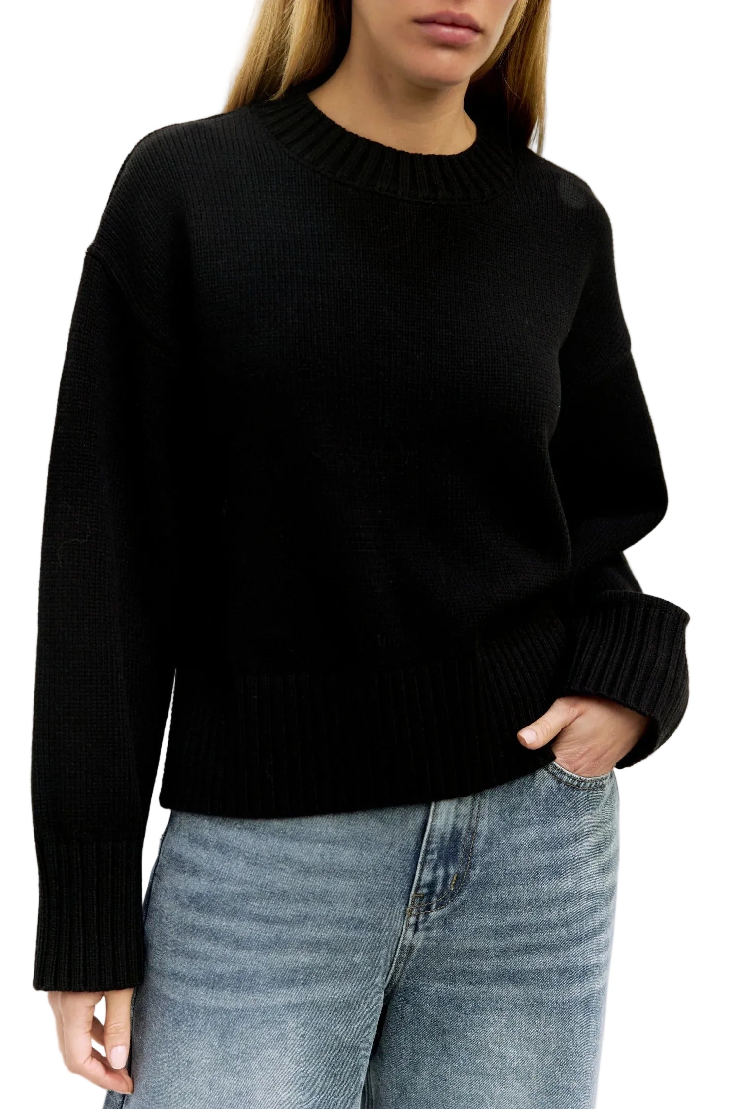 An oversized cropped pullover sweater with a classic rib detail at the neckline and hem. The semi-cropped length ensures a proportional fit and the mid-weight fabrication makes it perfect for the colder seasons ahead.