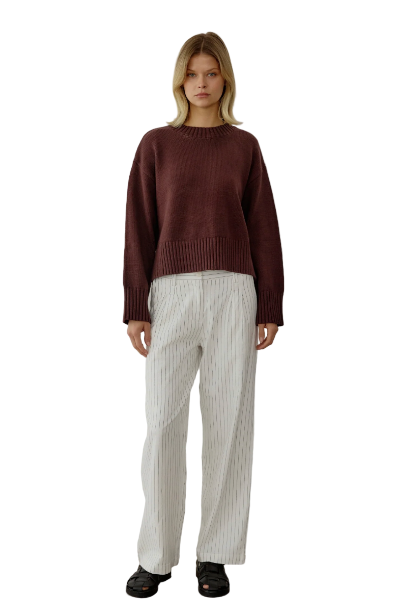 An oversized cropped pullover sweater with a classic rib detail at the neckline and hem. The semi-cropped length ensures a proportional fit and the mid-weight fabrication makes it perfect for the colder seasons ahead.