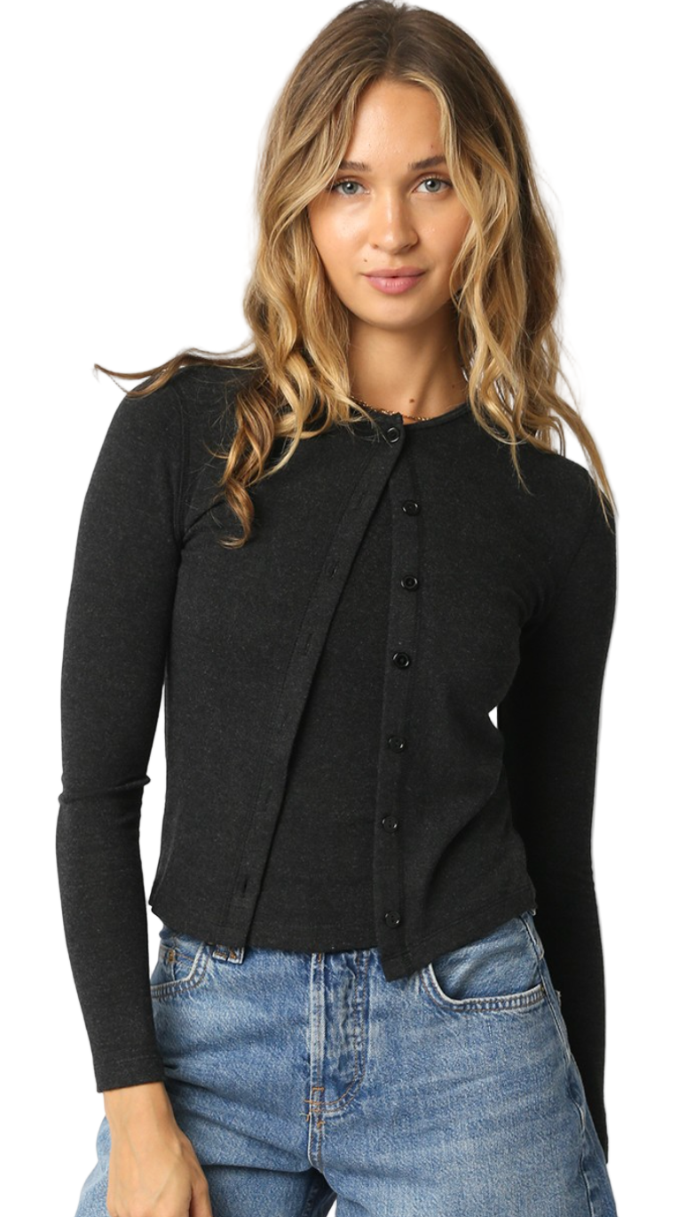 Knit cardigan features a round neck and a button down.
