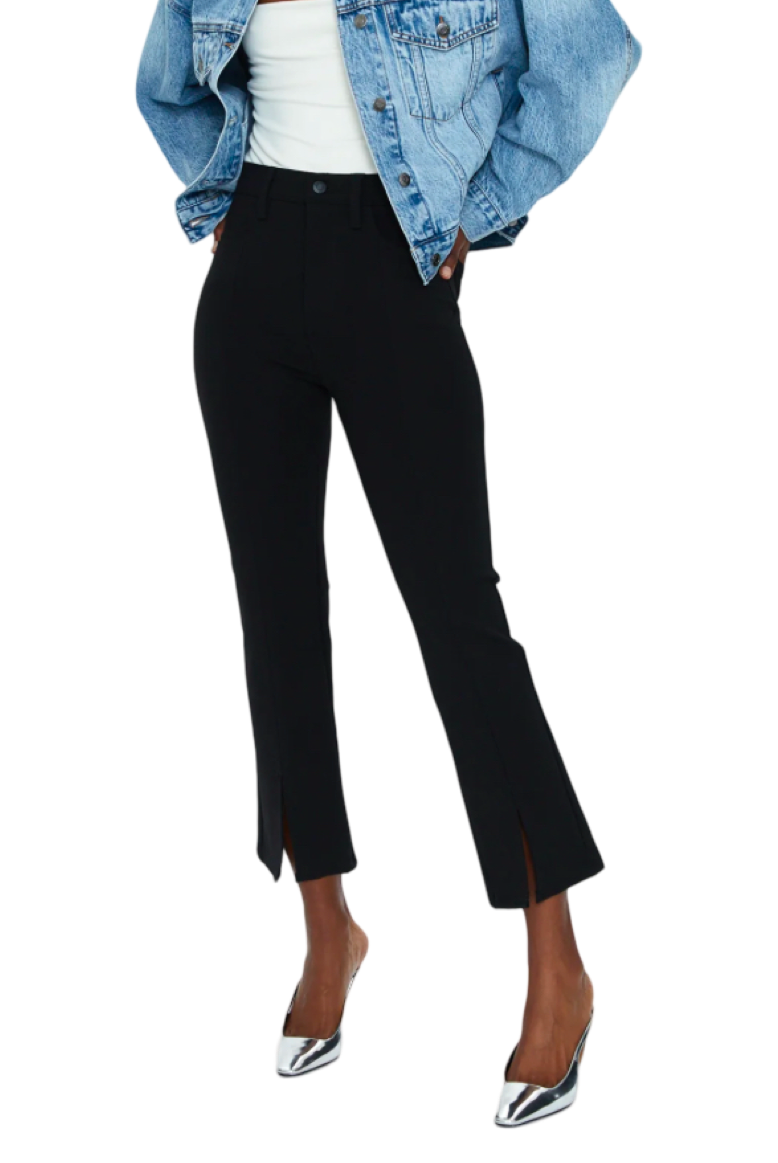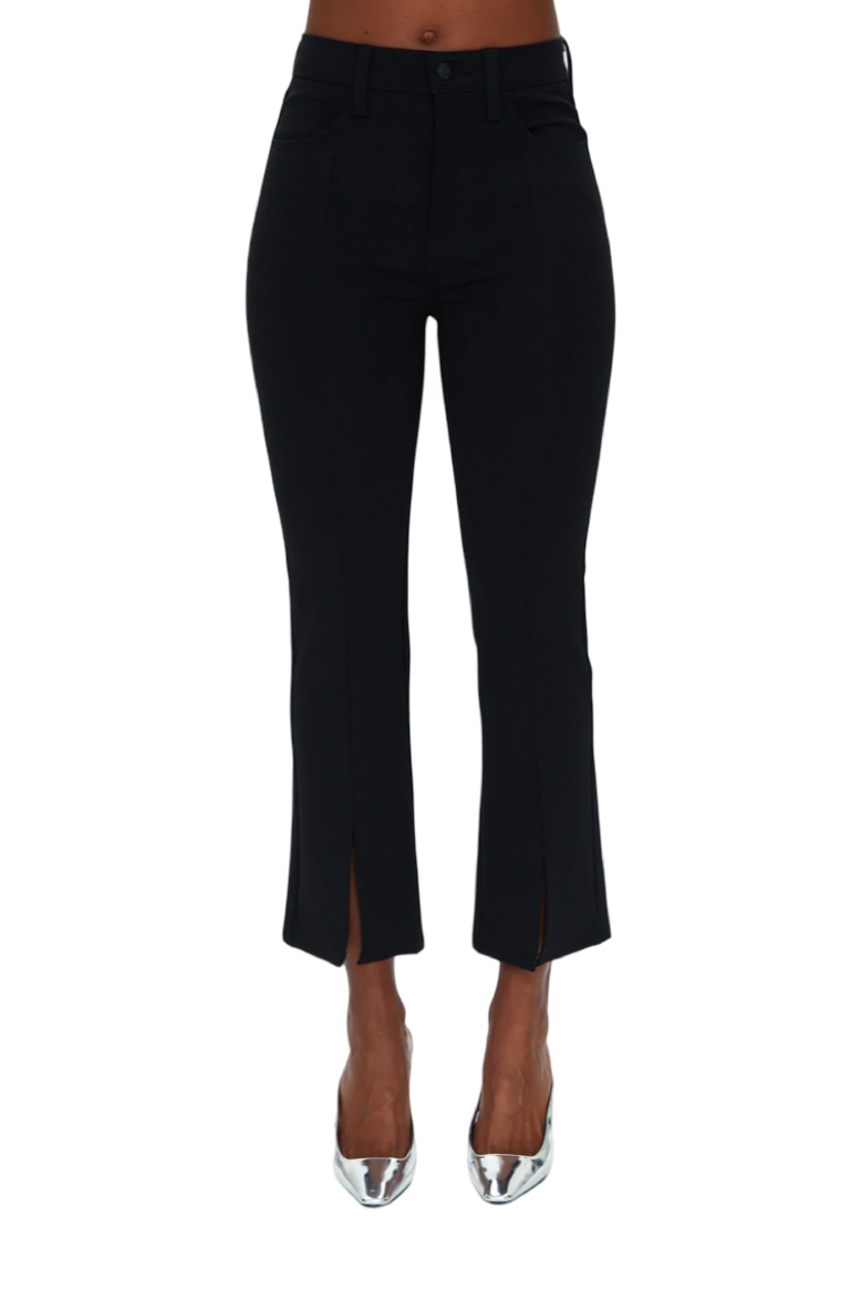 Cropped boot cut pant. Hugs from the hips to the knee and flares out right above the calf for a proportional effect. Featured in a rich saturated black with centre front slits at the hem.