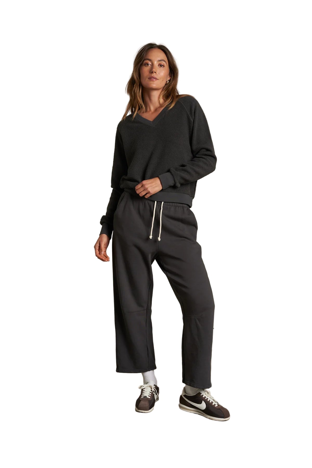 The fallon pant is made from heavy fleece and designed to be the sweatpant that has it all. with side pockets, a pull-on waist with natural drawcord tie, and a barrel leg that tapers into a straight, slightly cropped finish, this bottom is equal parts practical and flattering.