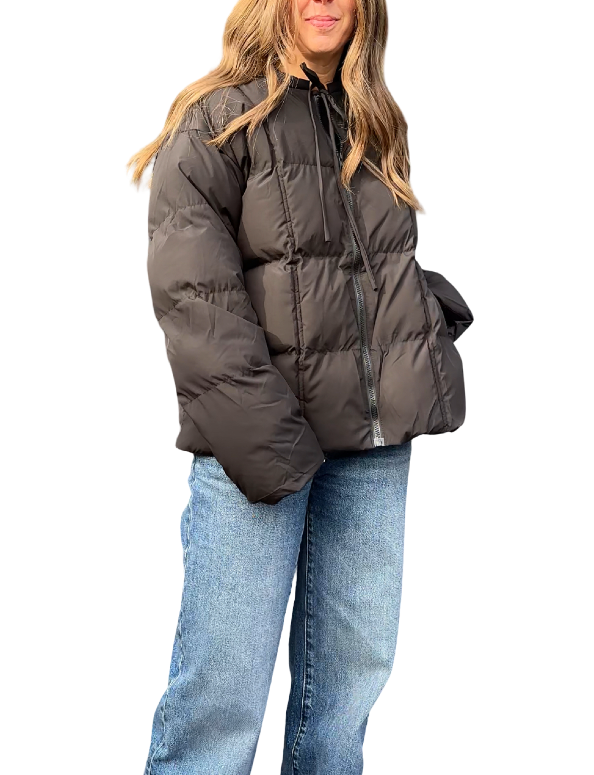 Wind resistant outer shell. High collar with front zipper and decorative front tie closure. Long sleeves with interior cuffs.